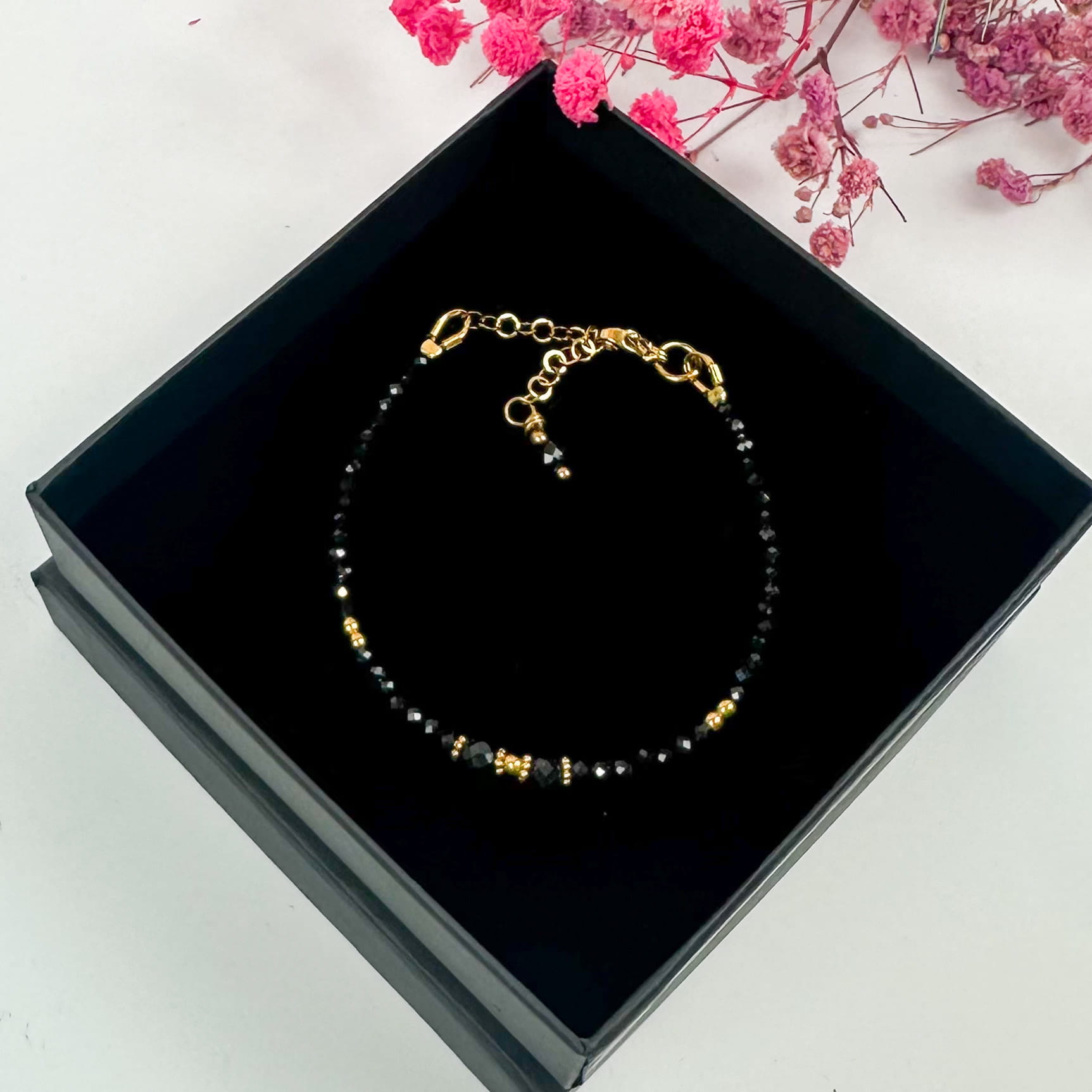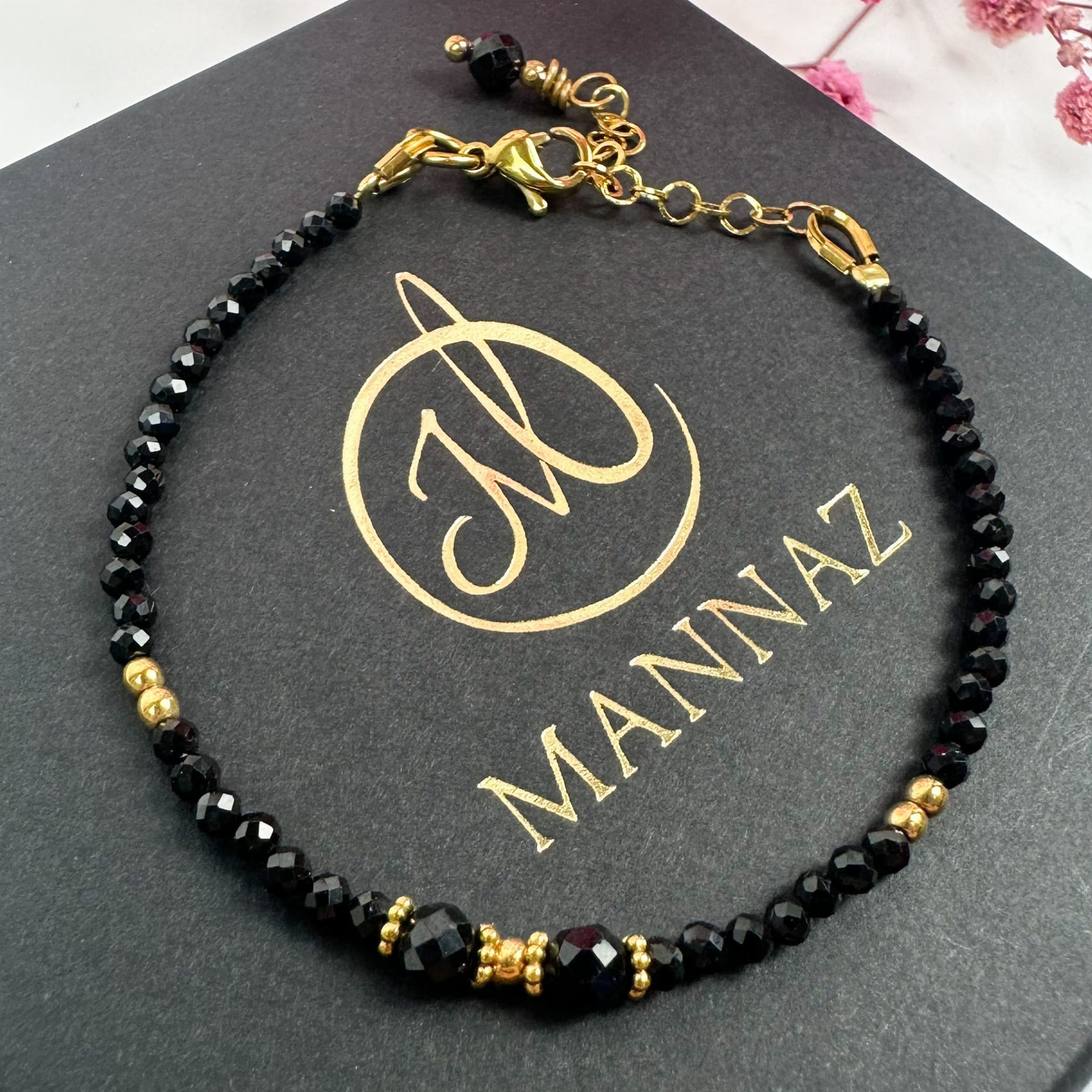 Delikatna bransoletka wykonana z drobnych, fasetowanych turmalinów (ok. 2,3 mm), przełamana złotymi akcentami hematytu. Elegancka i lekka, doskonale sprawdzi się jako talizman ochronny noszony na co dzień. Jej ponadczasowe połączenie czerni i złota sprawia, że będzie pasować do każdej stylizacji.