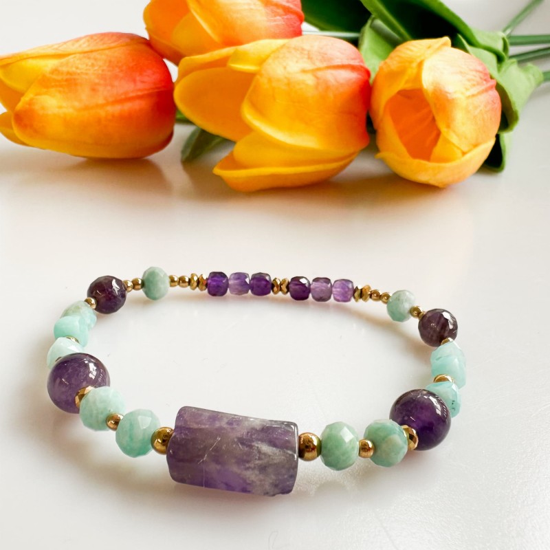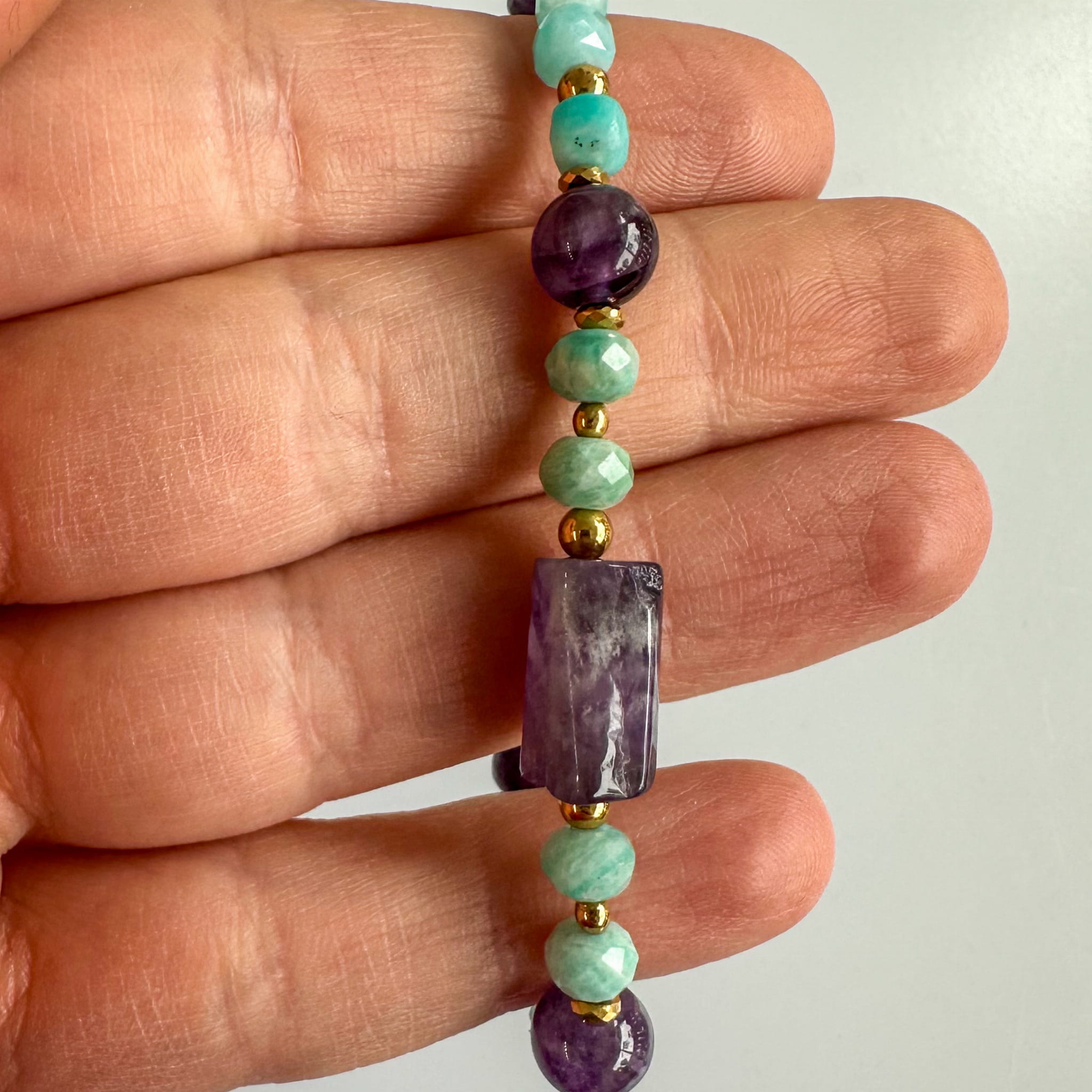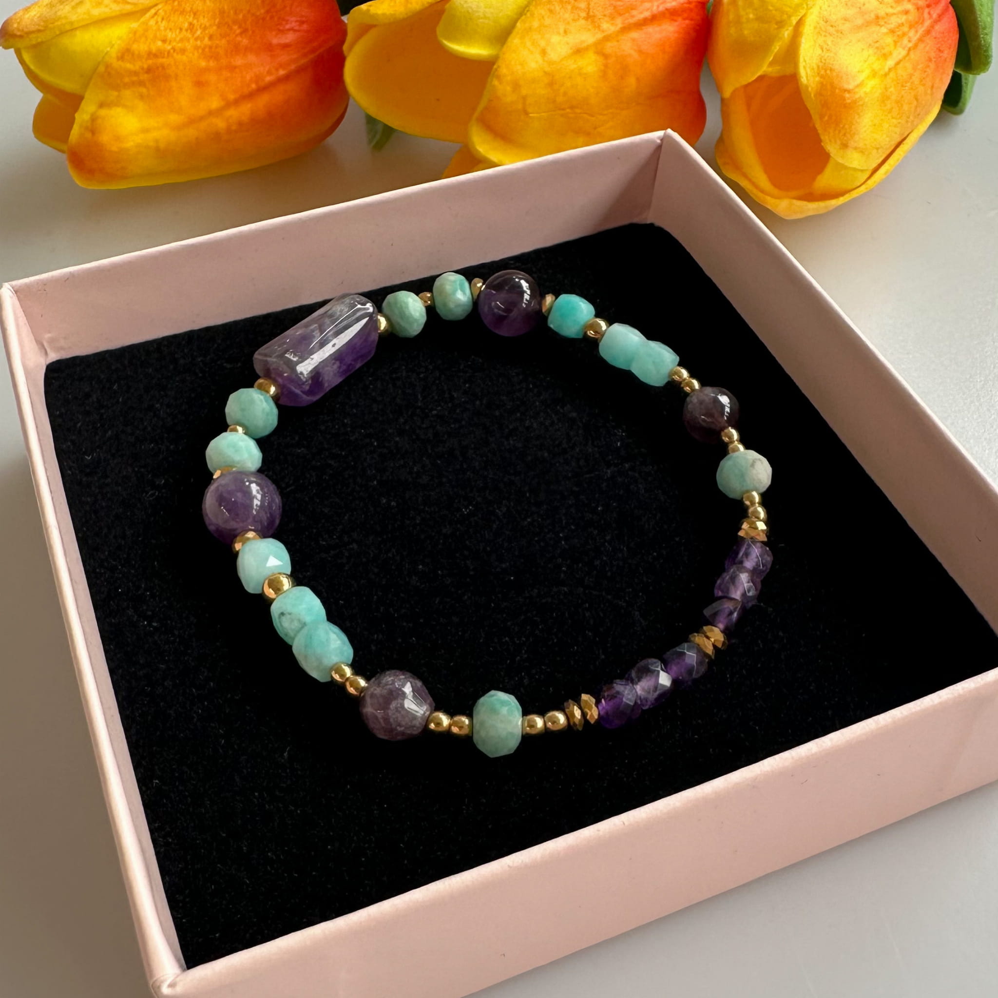 Zainwestuj w siebie i podkreśl swój wyjątkowy styl z bransoletką na gumce z ametystem i amazonitem.