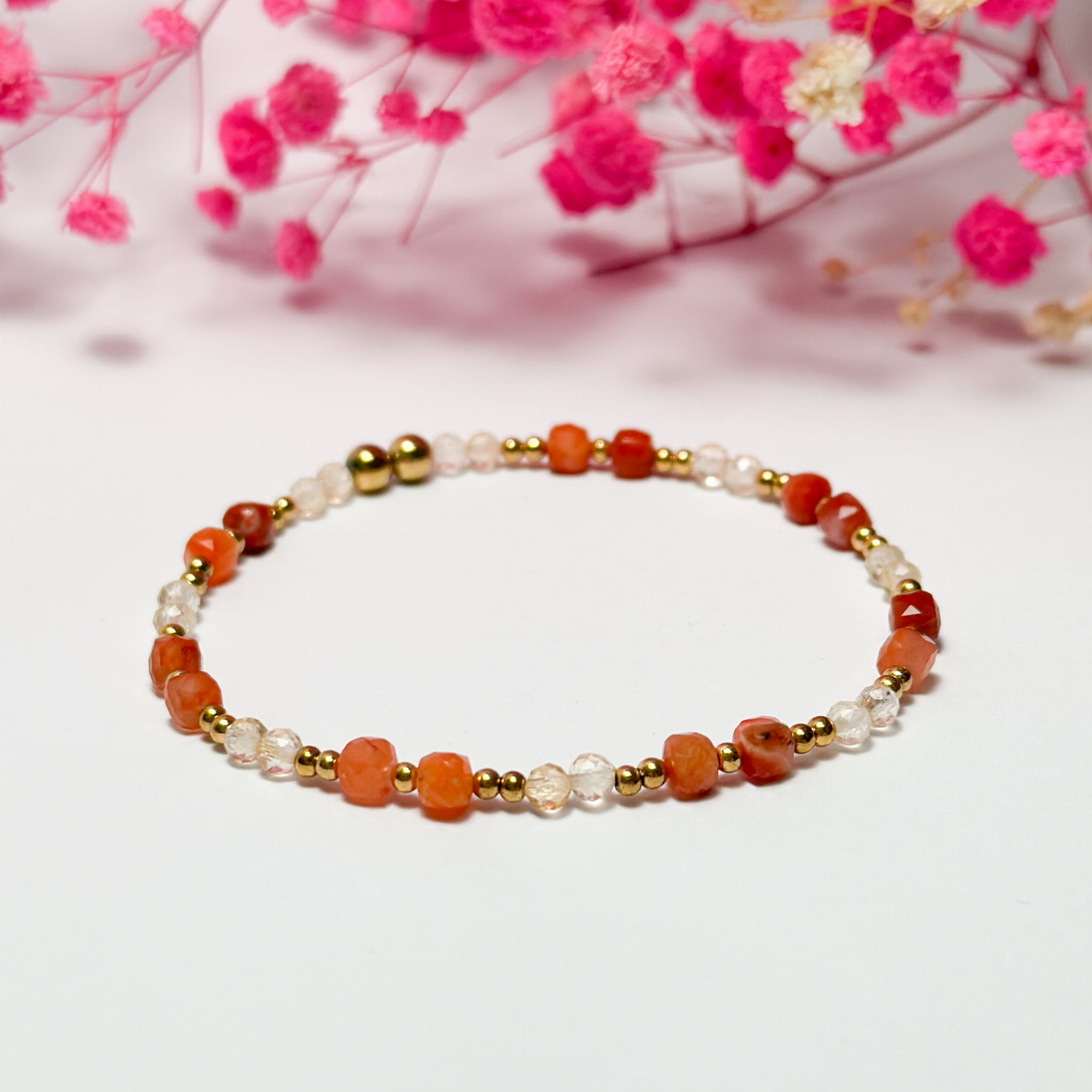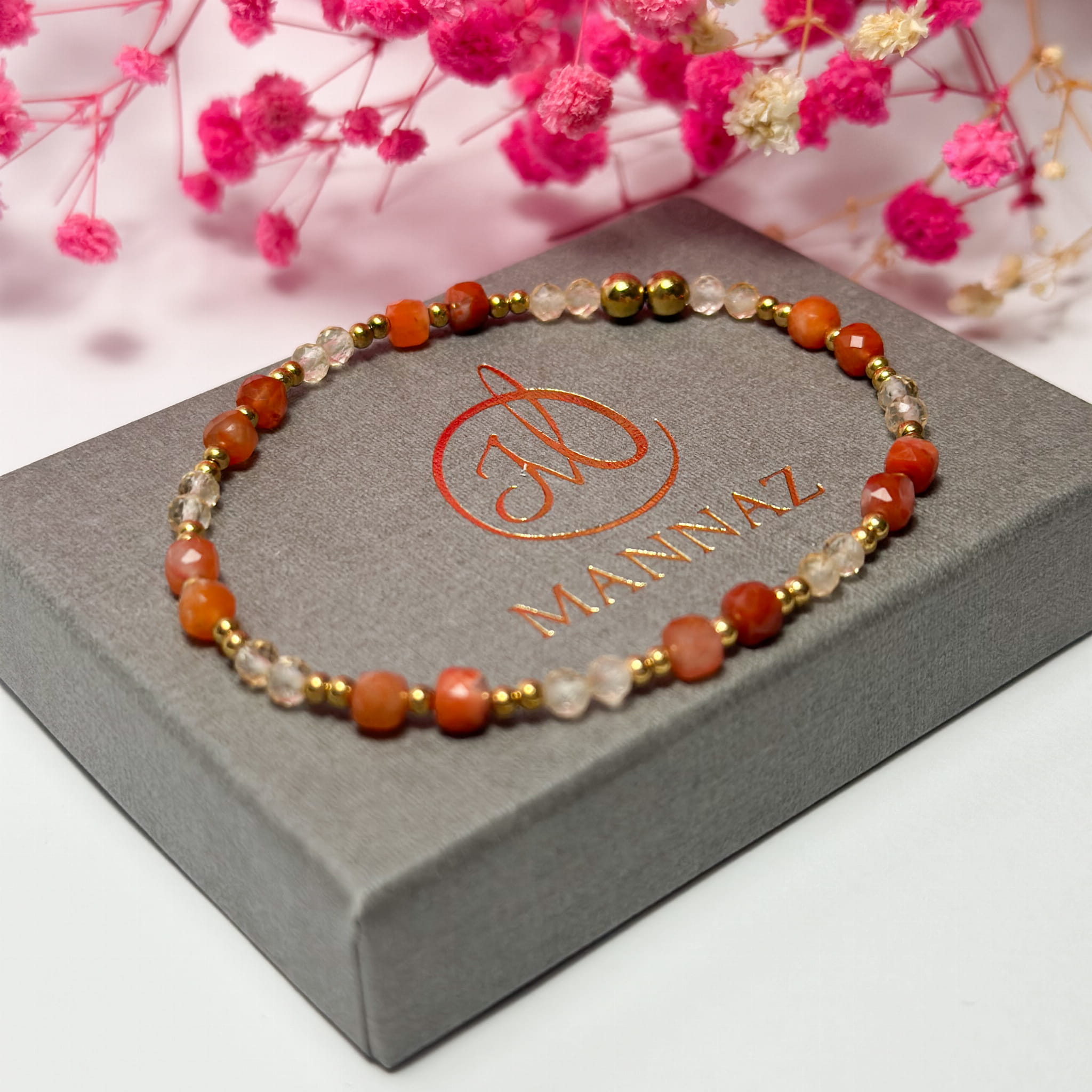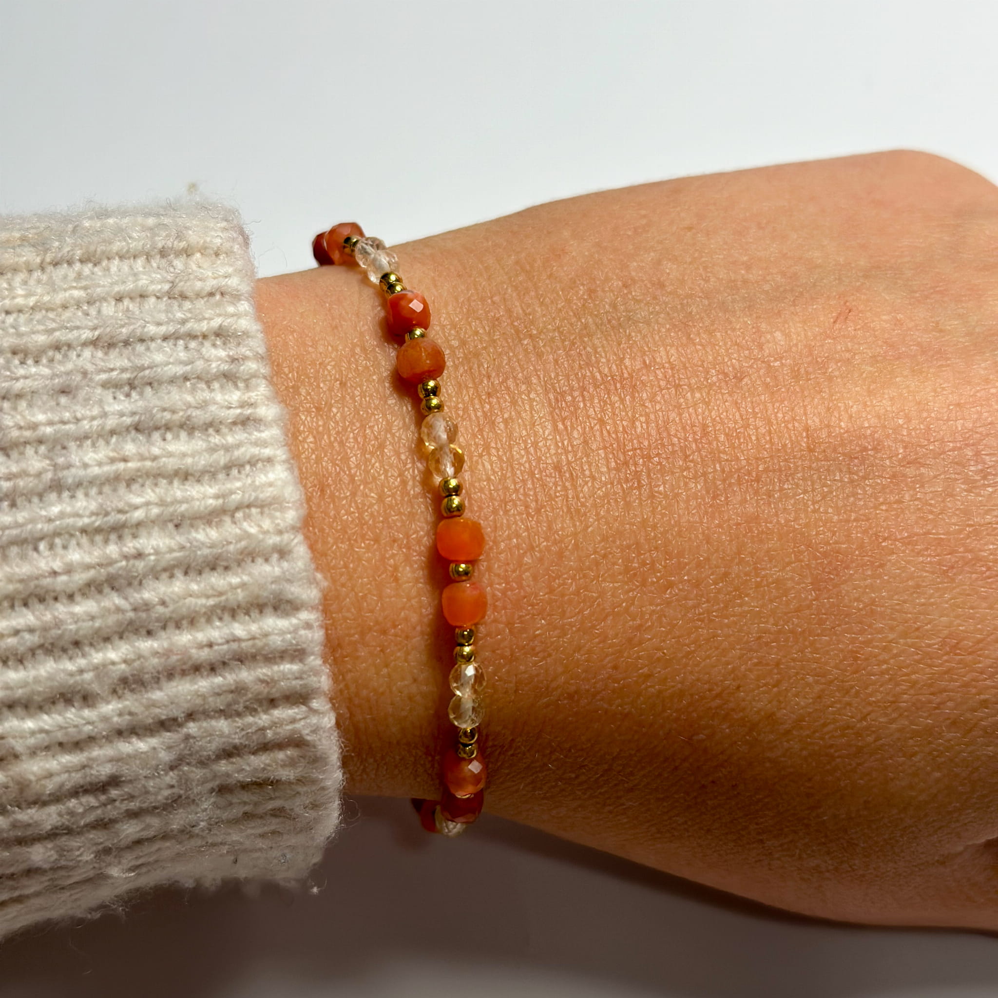 Odkryj naszą wyjątkową bransoletkę na gumce, która łączy w sobie moc cytrynu, karneolu i złotego hematytu.