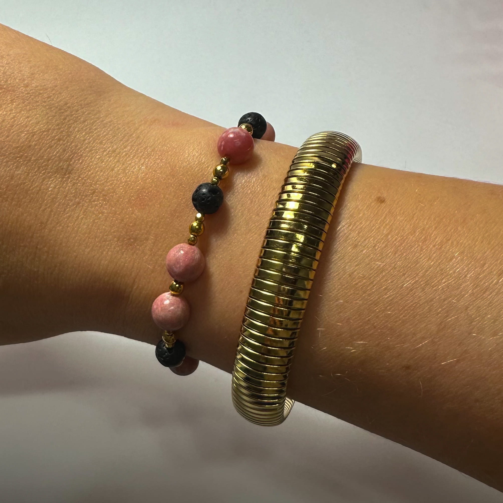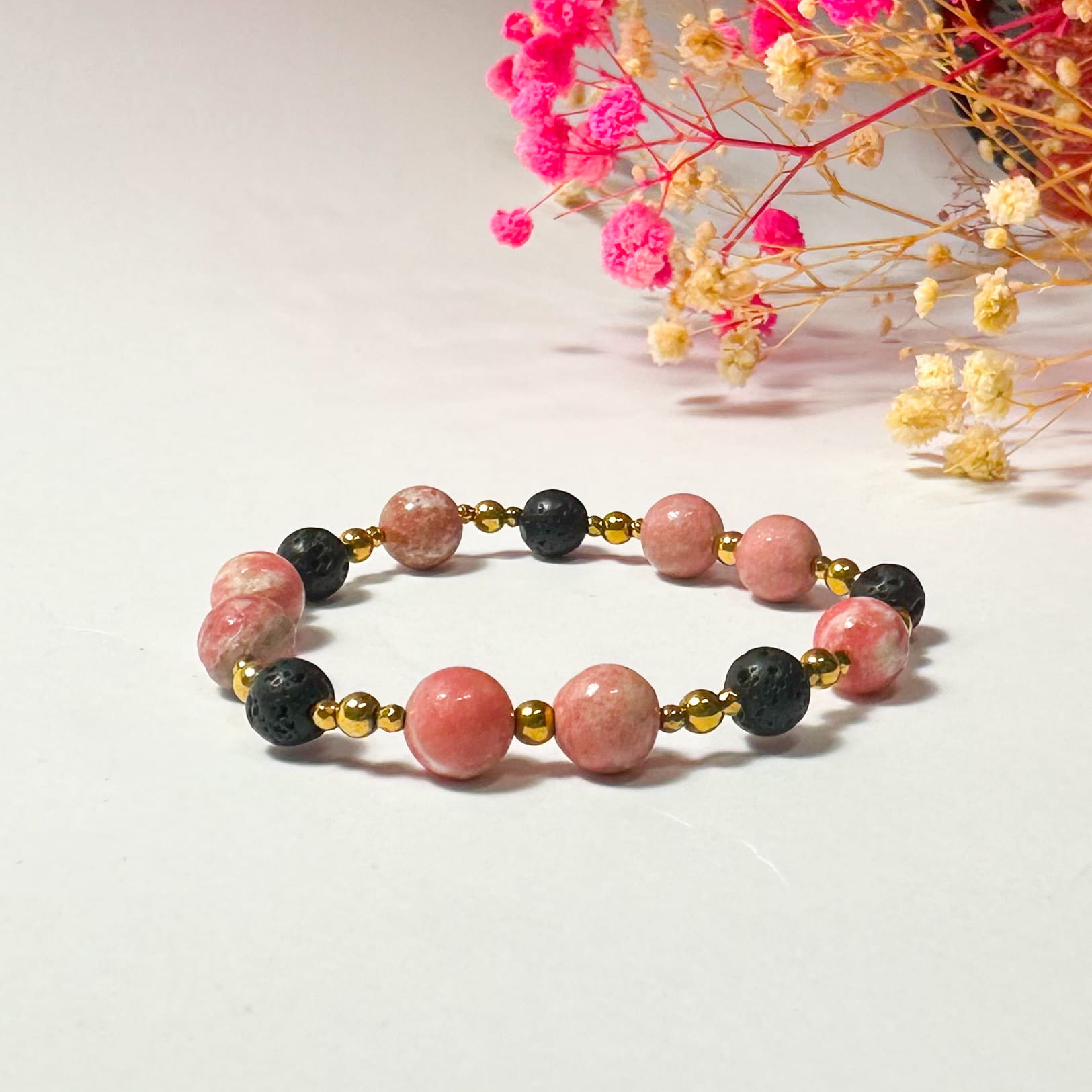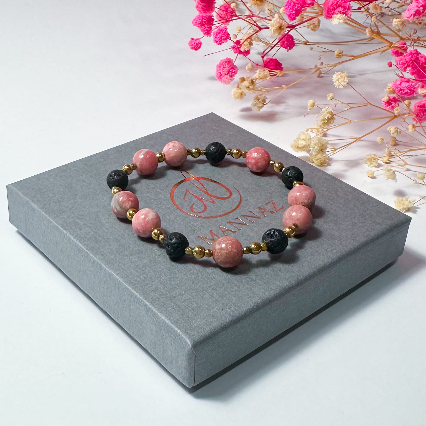 Bransoletka ta łączy w sobie surowość lawy wulkanicznej, która jest symbolem siły i stabilności, z delikatnością rodochrozytu, kamienia miłości i