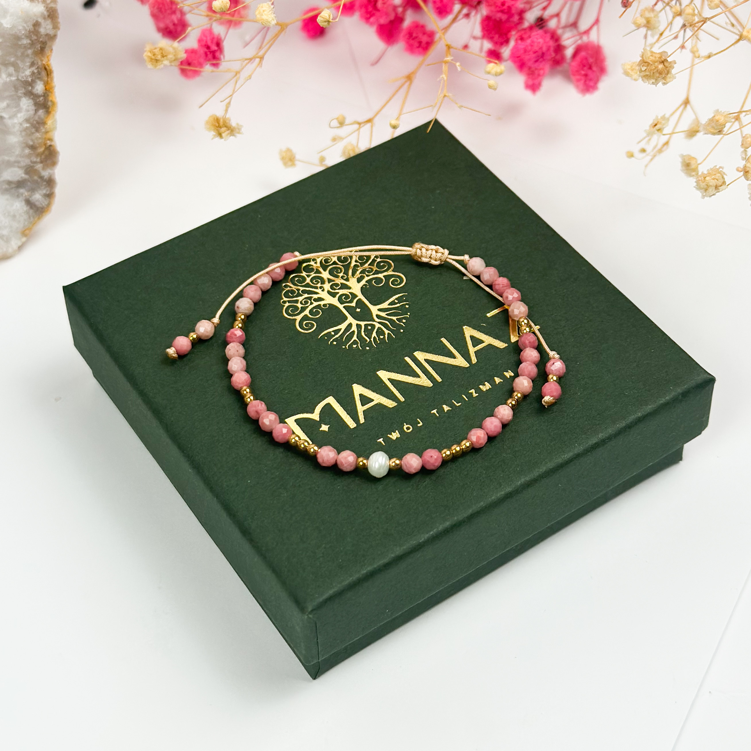 Ta subtelna bransoletka z naturalnym rodonitem, perłą i złotym hematytem została stworzona, by przywracać równowagę tam, gdzie emocje biorą górę.