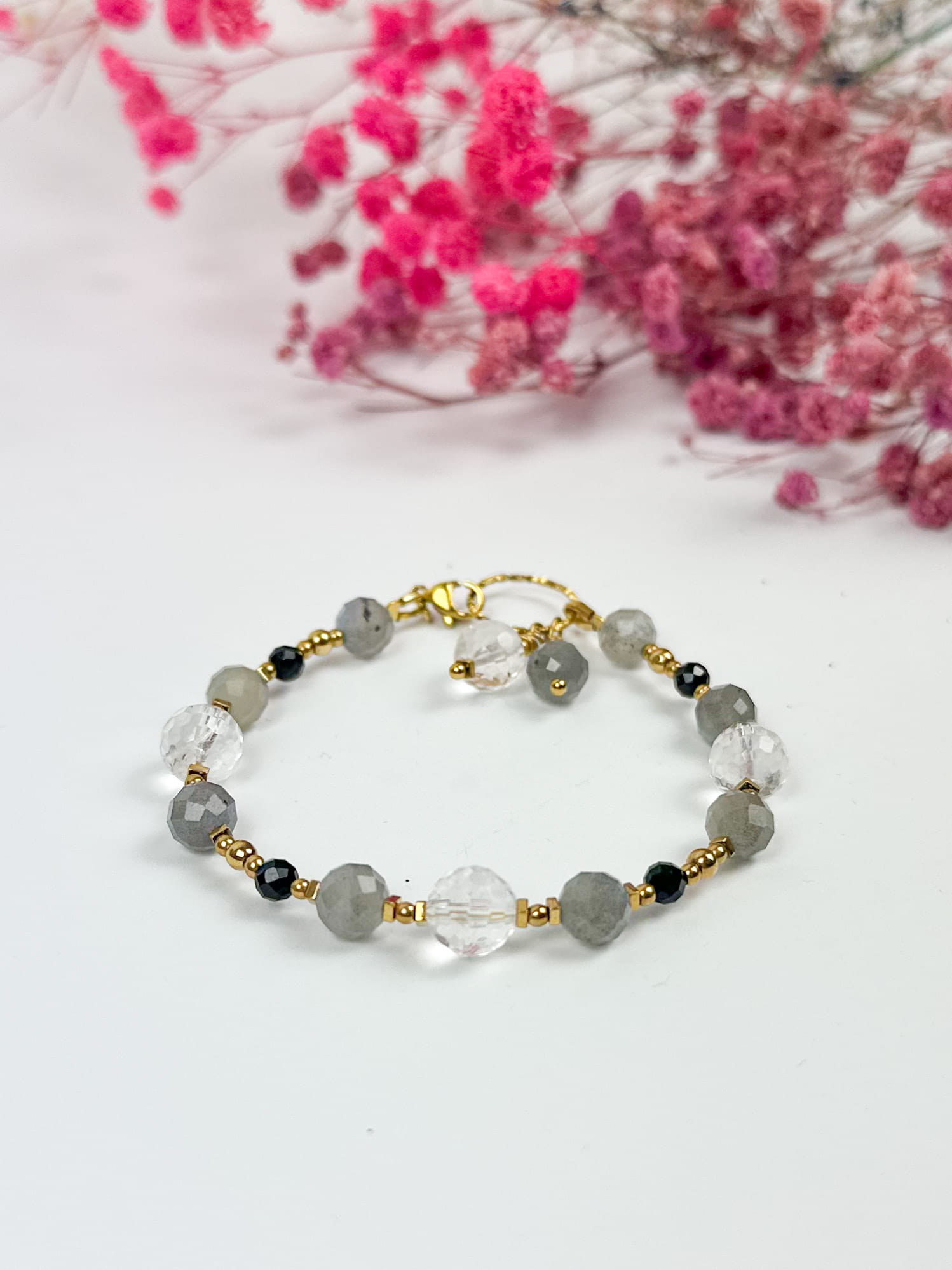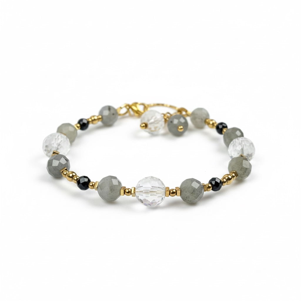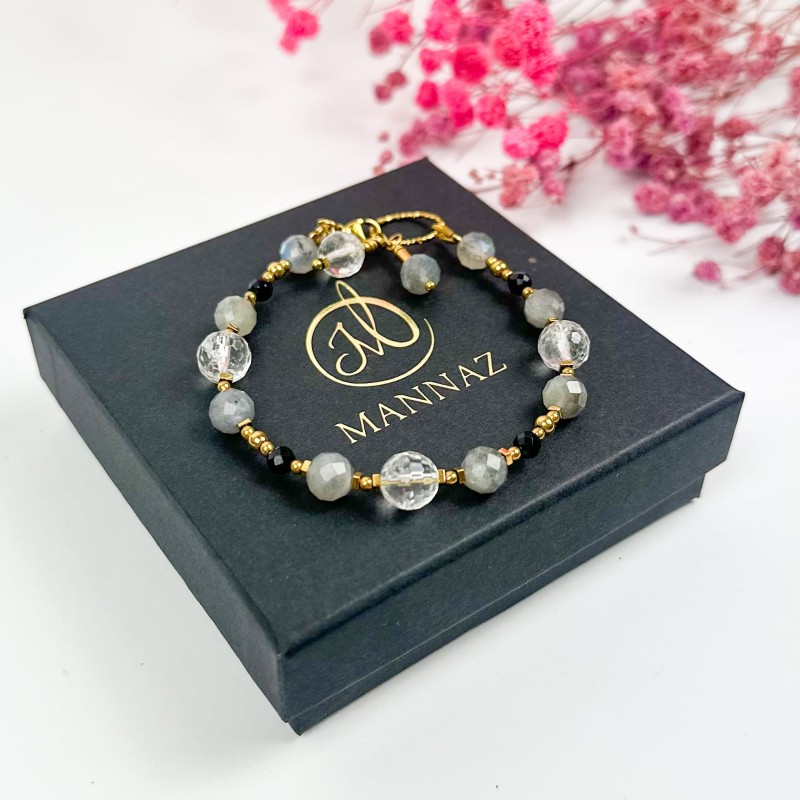 Odkryj bransoletkę, która łączy w sobie siłę trzech wyjątkowych minerałów. Ręcznie wykonana z naturalnego czarnego turmalinu, labradorytu i kryształu górskiego, stanowi elegancki talizman codziennej ochrony, wyciszenia i jasności umysłu.