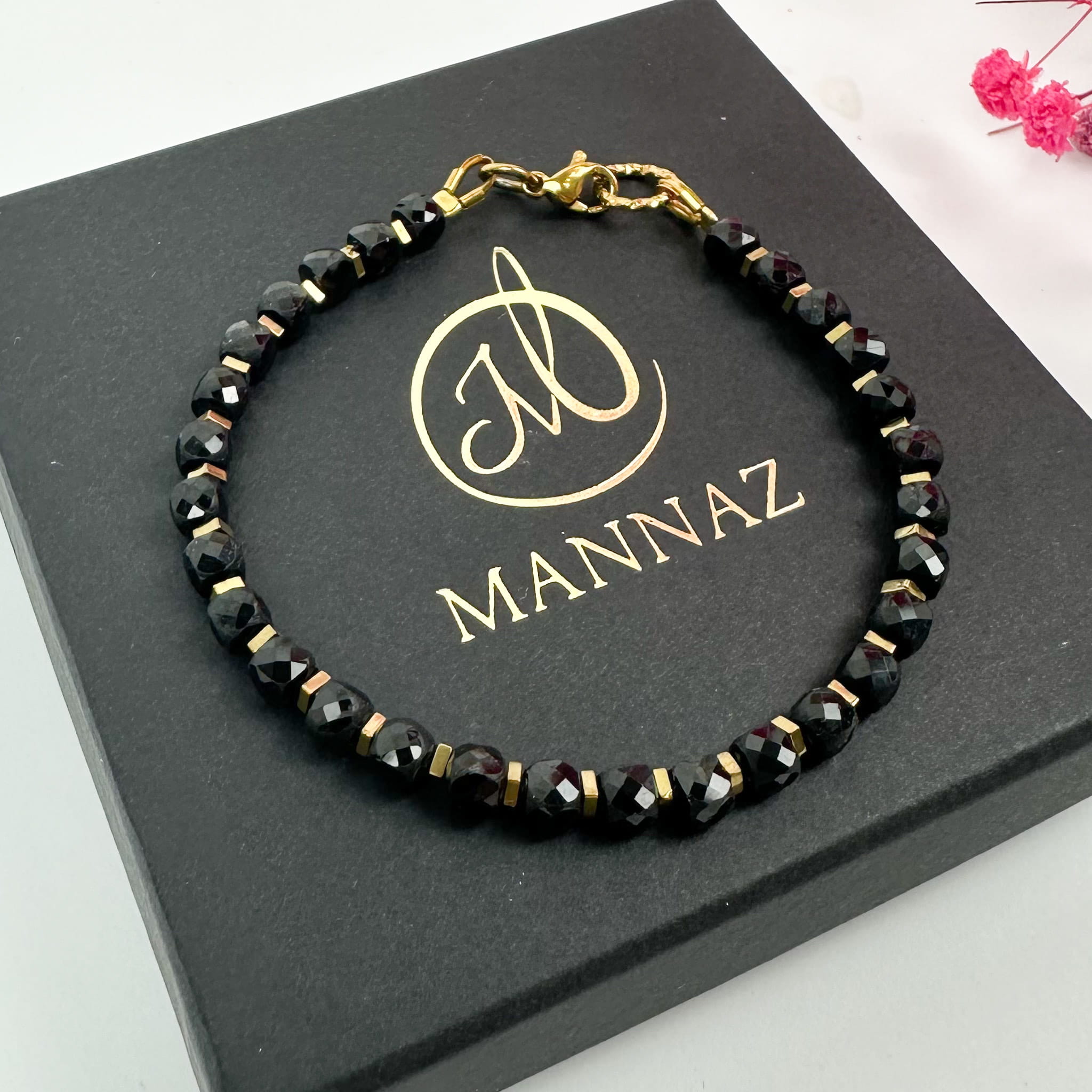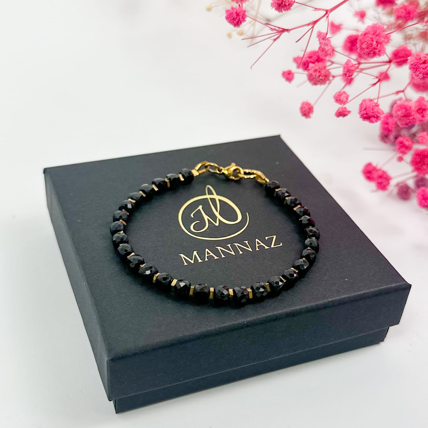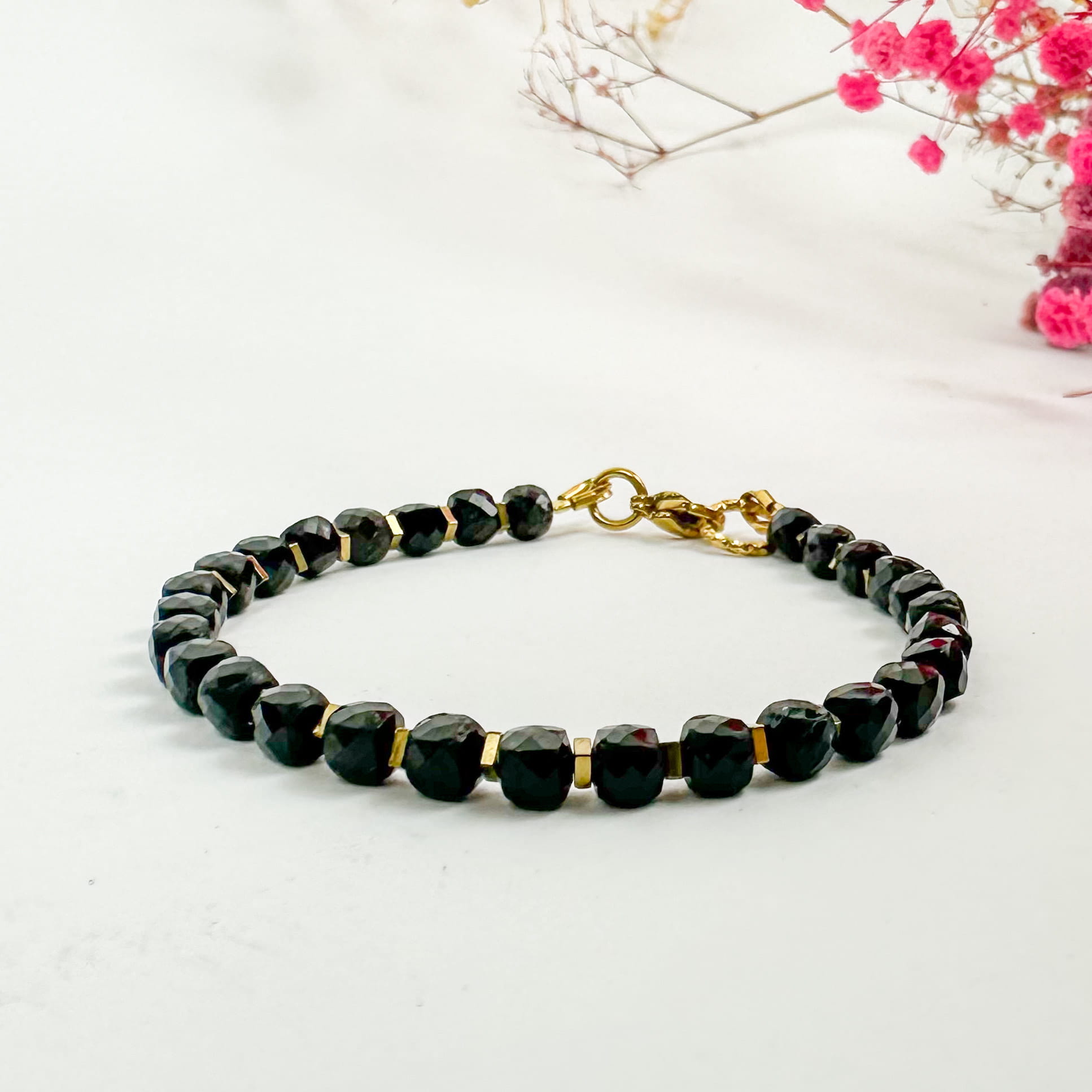 Bransoletka wykonana z naturalnych kostek czarnego turmalinu (4x4 mm), przełamanych złotym hematytem. Zapięcie wykonane ze stali szlachetnej PVD gwarantuje trwałość, odporność na ścieranie i bezpieczeństwo noszenia. To biżuteria, która łączy w sobie mocny charakter i subtelną elegancję – idealna jako osobisty amulet ochrony.