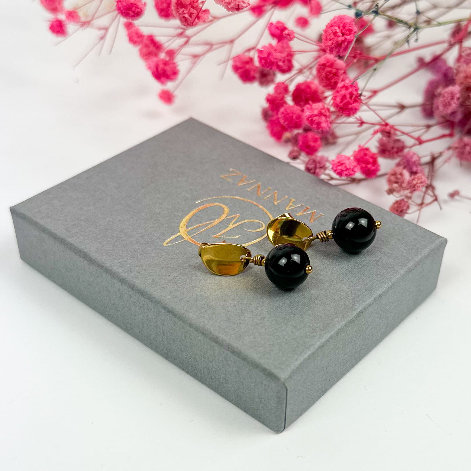 Kamienie: czarny turmalin (kostki 4x4 mm), złoty hematyt
