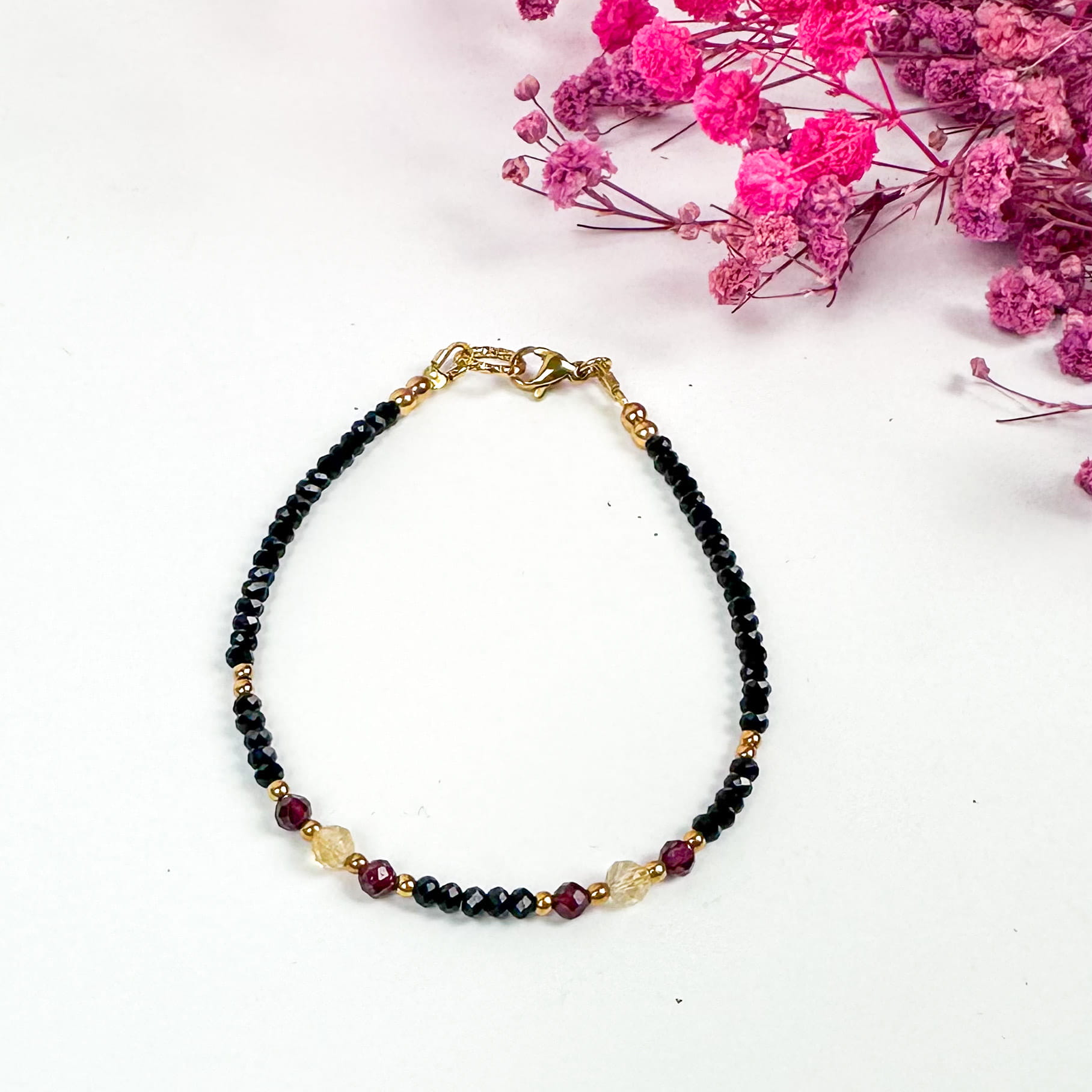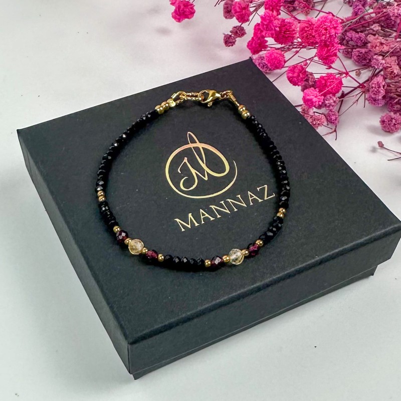 Ta subtelna, a jednocześnie pełna mocy bransoletka została wykonana z naturalnych kamieni: czarnego turmalinu, granatu i cytrynu. To połączenie, które wspiera Cię na co dzień – chroni, wzmacnia wewnętrzną siłę i otwiera na dobre energie.
