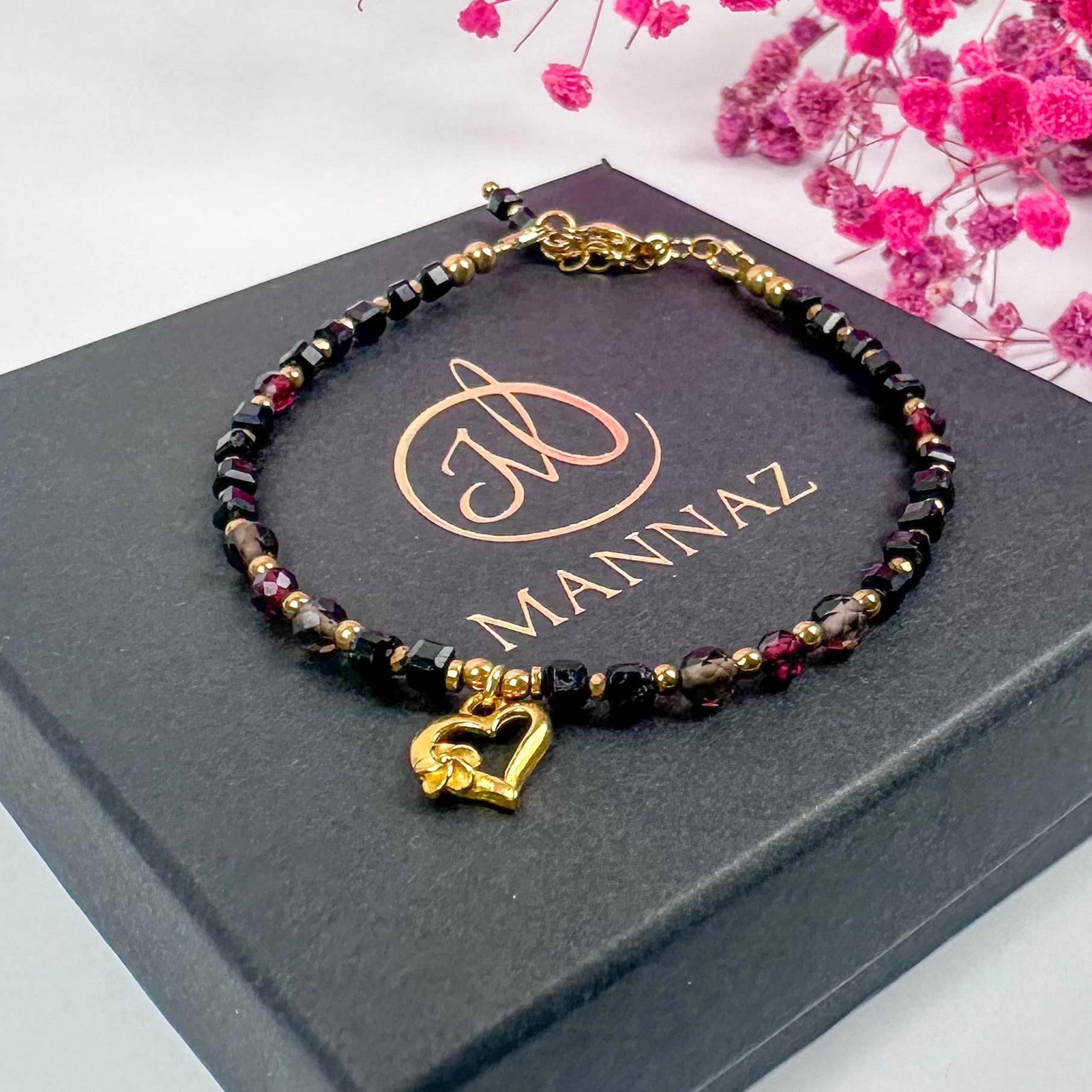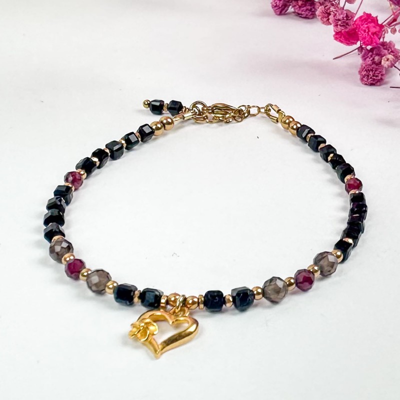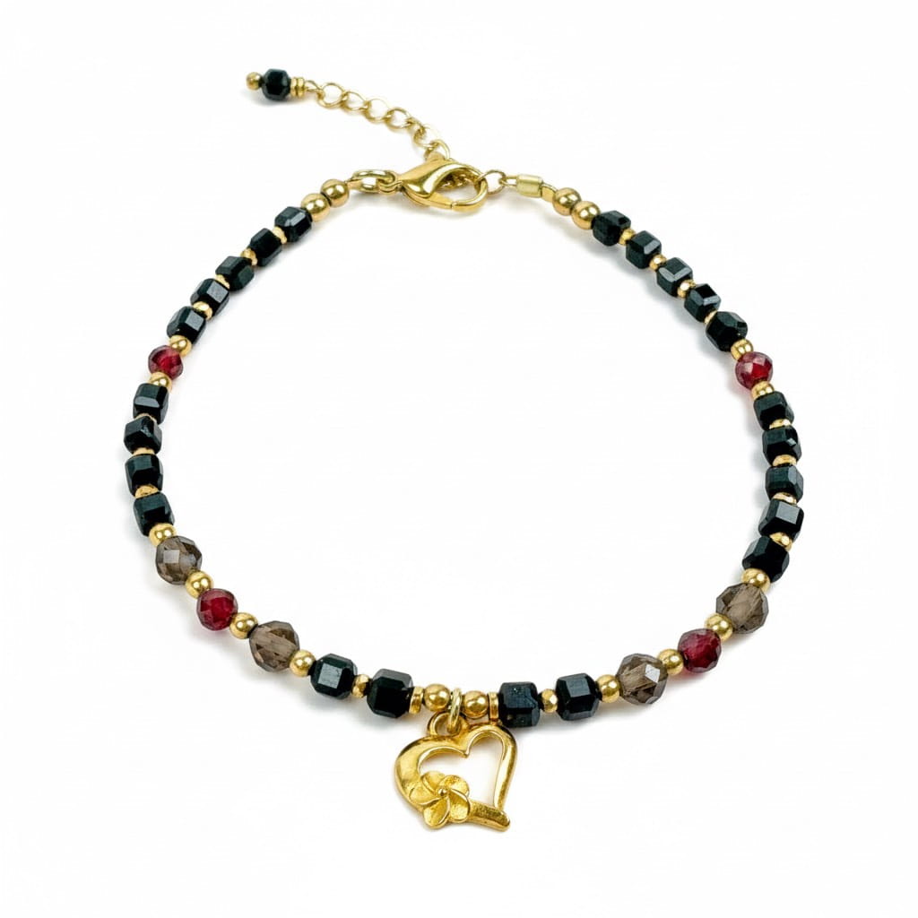 Ta bransoletka to talizman, który nosi w sobie trzy energie: ochronę, spokój i pasję. Delikatna pozłacana zawieszka w kształcie serca dodaje jej symbolicznego znaczenia — to biżuteria stworzona, by przypominać o miłości: do siebie, do życia, do bliskich.